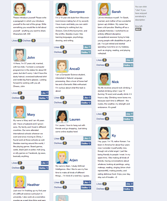 In Ostracism Online, participants enter a fake social networking site. After creating a bio, they are instructed to read and give likes to any of the other 11 participant profiles displayed. A pre-programmed algorithm assigns likes to the participant based on their experimental induction condition (6 likes = included, 12 likes = over included, 1 like = ostracized).